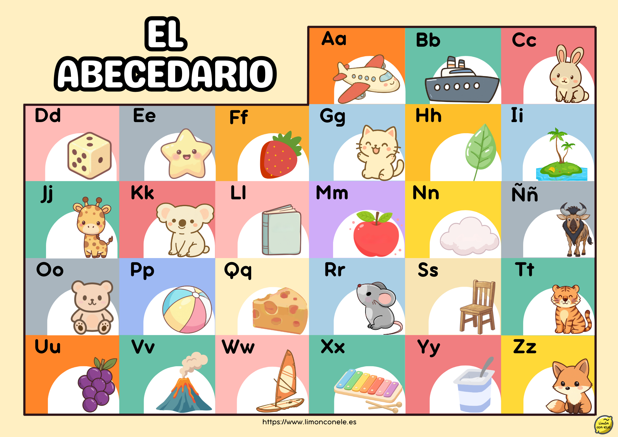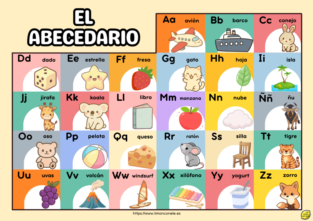 Aquí puedes descargar dos versiones del abecedario: una con solo las imágenes y otra con las imágenes y el nombre de las palabras, ideal para trabajar vocabulario: